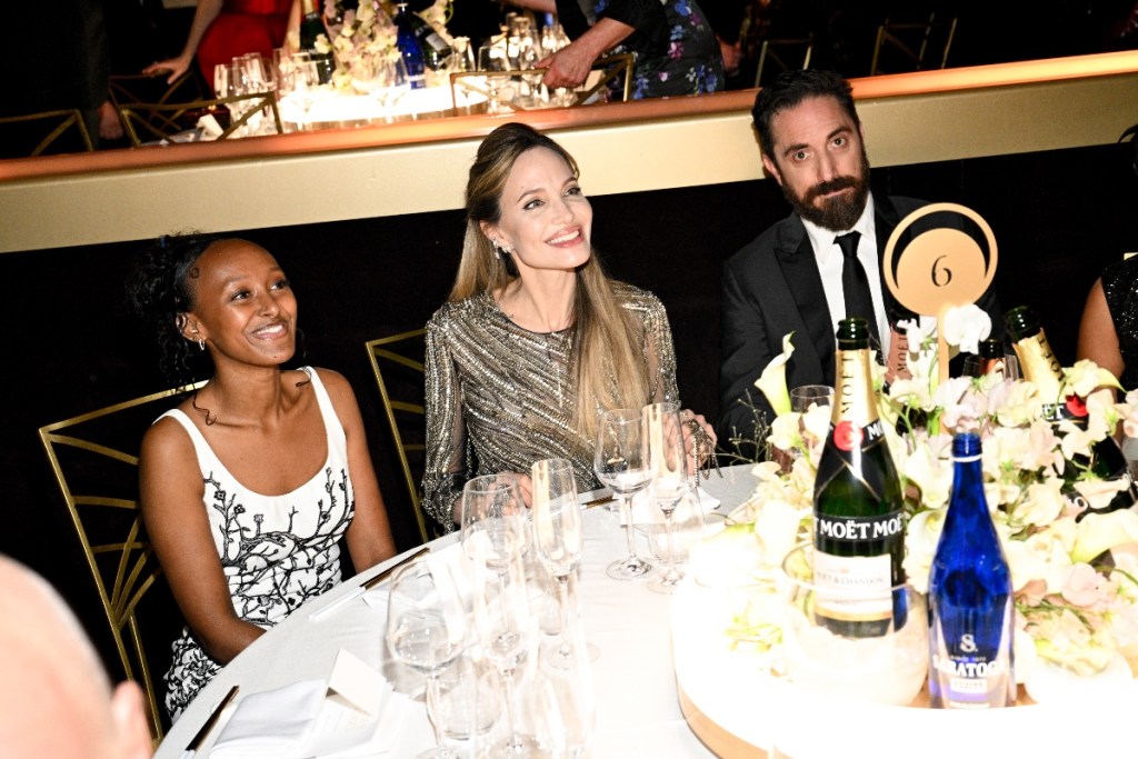 The duo arrived at the Beverly Hilton in Beverly Hills, California, to walk the carpet together. Angelina wore a shimmery, gold metallic gown with small, semi-sheer cutouts. Zahara opted for a white gown embellished with an intricate black tree.
