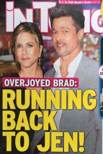 The new cover of In Touch exclaims, “Overjoyed Brad: Running Back To Jen!” The front of the issue further teases, “The truth at last: He never stopped loving Jen,” “What Brad told her about Angelina,” and “His emotional apology & shocking offer.” It’s all designed to make readers think Pitt wants to romantically reunite with Aniston. And the phrase “the truth at last” is especially ironic since this tabloid so rarely offers anything resembling the truth.
