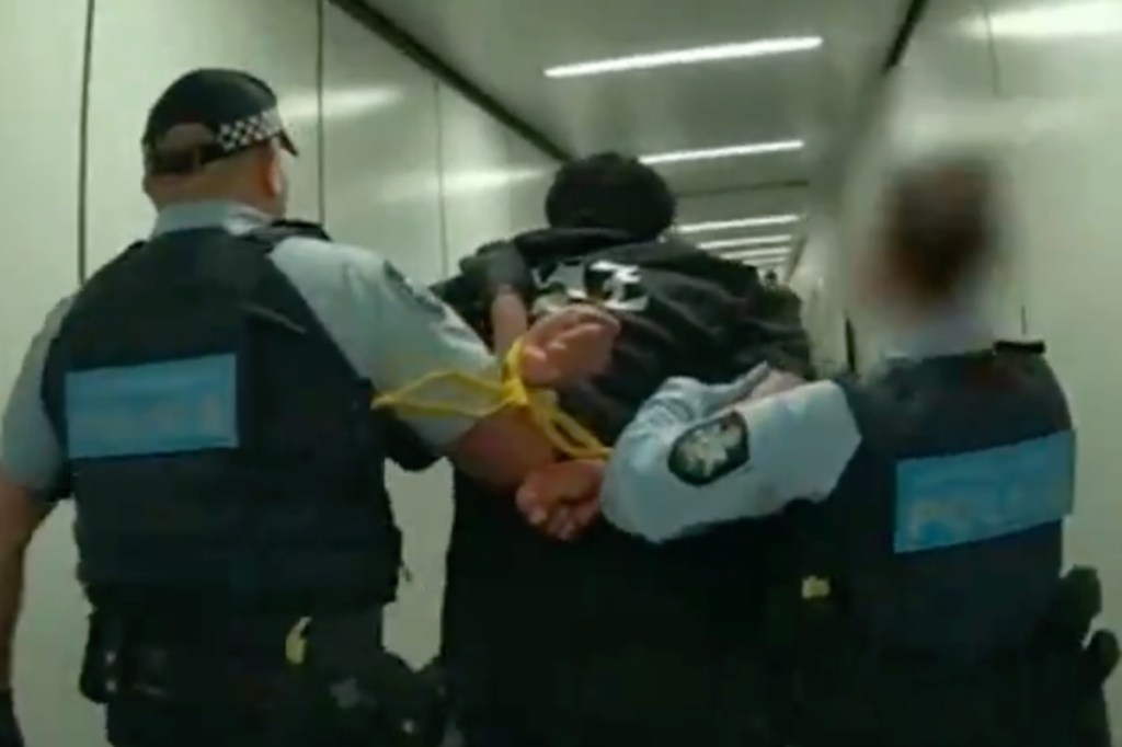 Footage reveals that the man, whose name has not been publicly disclosed, was escorted off the plane with his hands zip-tied behind his back.