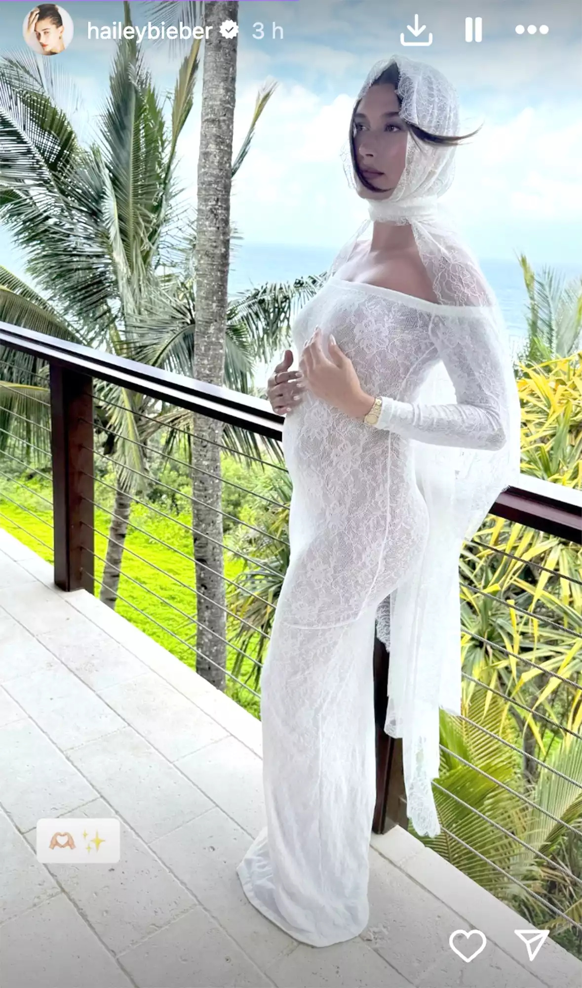 The new image showed Hailey wearing an off-the-shoulder white lace Saint Laurent by Anthony Vaccarello dress and a long veil. She posed on a wooden balcony for the shot.