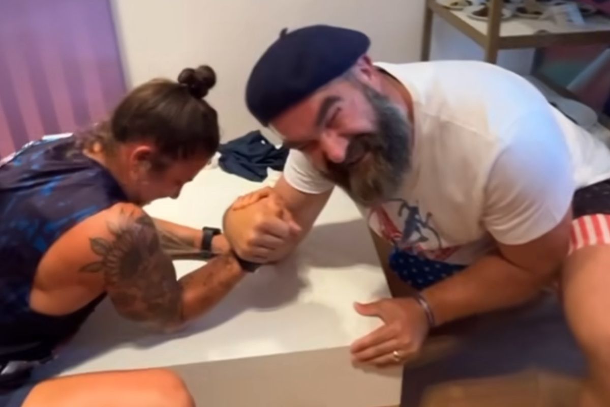 “Challenged Jason Kelce to an arm wrestle,” she wrote over the clip.