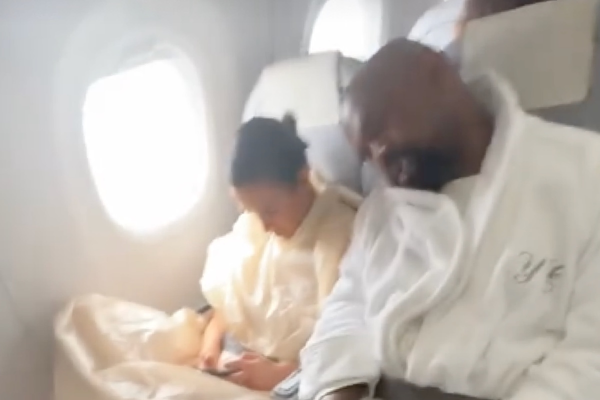 Despite their seats being at the very front, the unexpectedly conservatively dressed couple did not seem to belong to business class. Ye, rocking a monogrammed white robe with matching pants and shoes, took a sky-high nap during the flight.