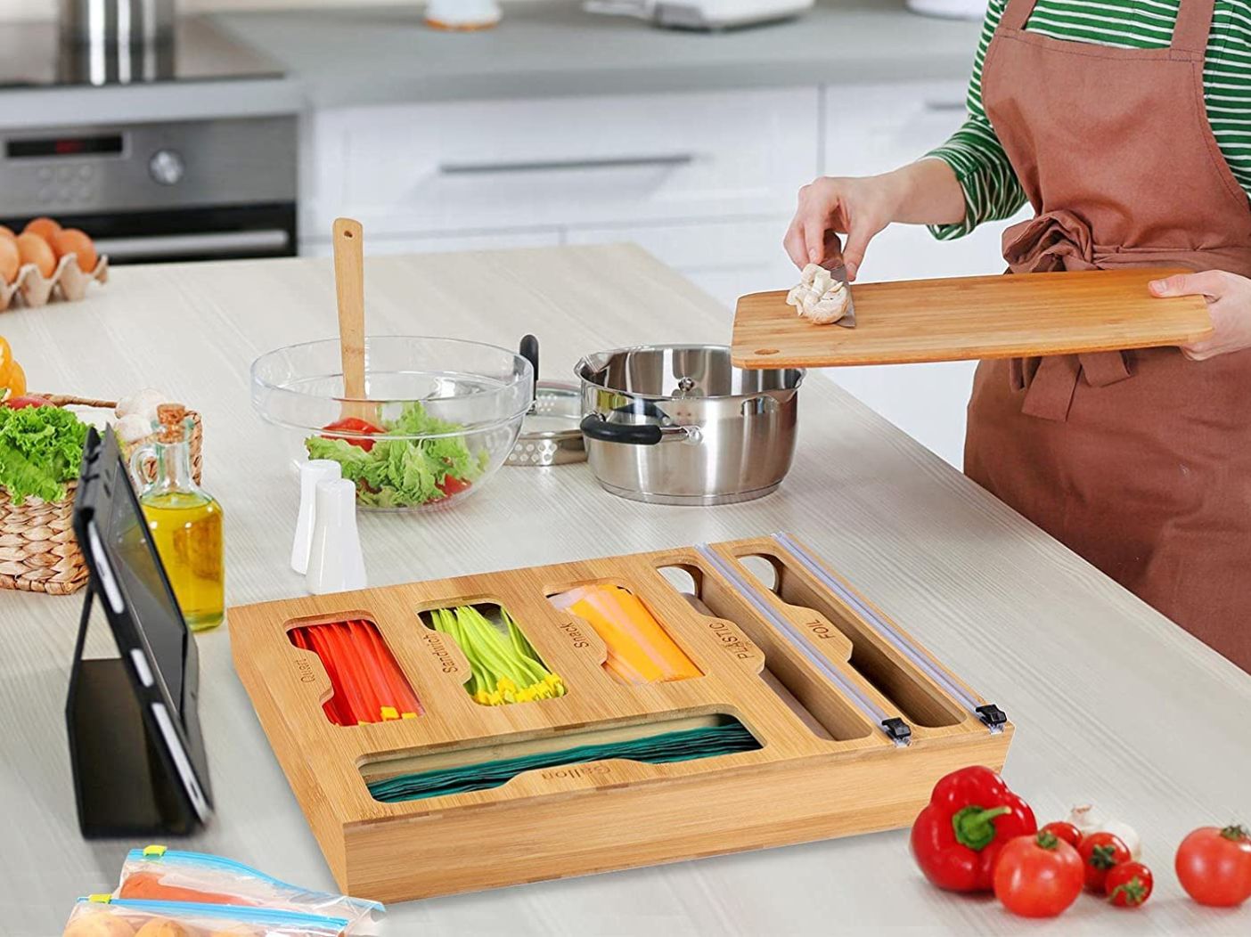 The bamboo container easily allows you to store different sizes of bags. It has separate compartments for quart-size, gallon-size, sandwich, and snack bags. It easily fits in a large drawer, but it’s pretty enough to be mounted on a wall.