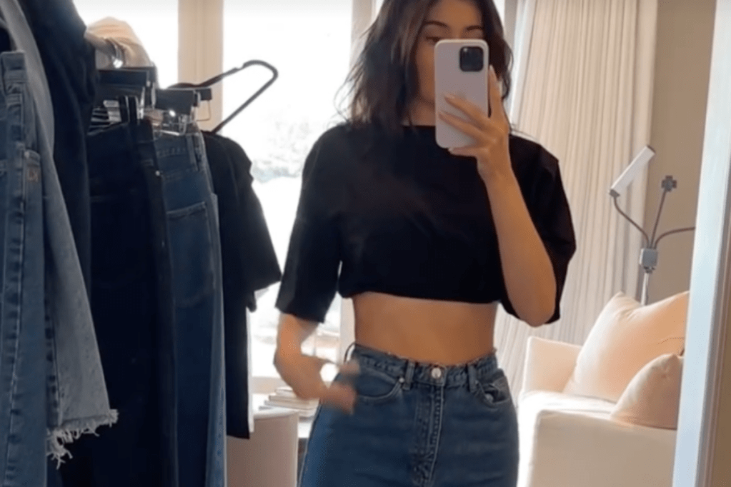 Jenner chose to wear a pair of low-rise jeans in a larger size for a more relaxed fit but also embraced the elegance of “classic, straight-leg” pants tailored perfectly to her figure. Kylie also showcased her style in a form-fitting, one-shoulder tee, a stylish cinched shirt, and a chic crop top.