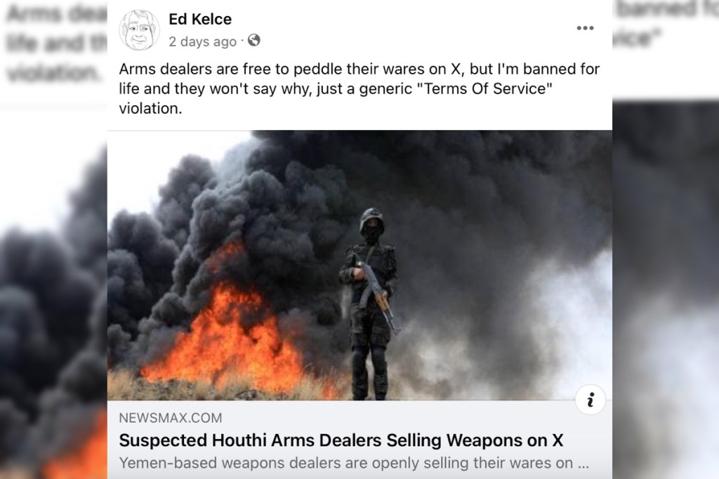 In a Facebook post, Ed shared an article alleging that arms dealers in Yemen are selling weapons on X and conducting business in Sanaa, a city controlled by the Houthis.